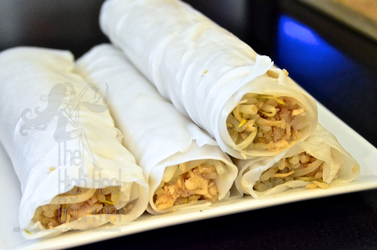 1) แผ่แผ่นก๋วยเตี๋ยวออก ใส่ถั่วงอกลวกและเนื้อปลาผัด ม้วนให้เป็นแท่ง ใส่จานรอไว้ ทำจนหมดไส้ น่าจะได้สักสี่อันถ้าชอบไส้มาก ถ้าชอบเส้นใส่ไส้ให้น้อยๆอาจจะห่อได้สักหกอัน